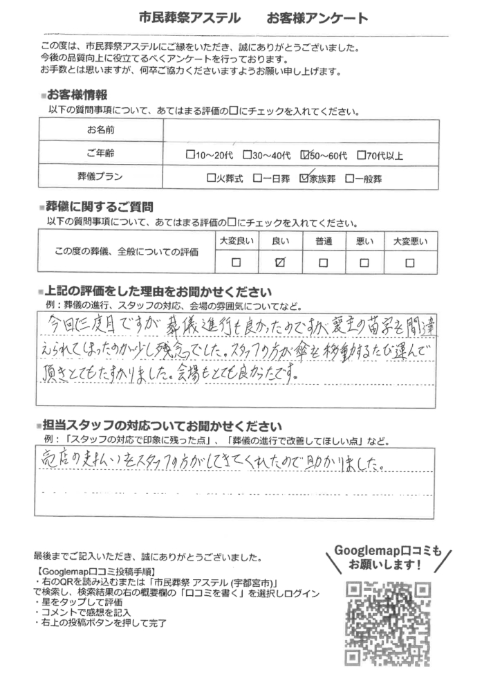 施行させていただいた葬儀事例 項目詳細葬儀プラン家族葬プラン葬儀総額費用646,000円参列人数130人火葬場宇都宮市悠久の丘火葬場の地域宇都宮市安置場所モーチュアリー美念堂安置場所の地域宇都宮市 同じエリアの葬儀事例 家族葬 宇都宮市悠久の丘|宇都宮市 6名の家族葬|【市民葬祭アステル】宇都宮市の葬儀・家族葬・直葬 施行させていただいた葬儀事例 項目詳細葬儀プラン家族葬プラン葬儀総額費用513,00... 2025年12月30日 家族葬 悠久の丘|宇都宮市 6名の友人葬|【市民葬祭アステル】宇都宮市の葬儀・家族葬・直葬 施行させていただいた葬儀事例 項目詳細葬儀プラン家族葬プラン葬儀総額費用1,195,... 2025年12月16日 家族葬 日光聖苑|日光市 30名の家族葬|【市民葬祭アステル】宇都宮市の葬儀・家族葬・直葬 施行させていただいた葬儀事例 項目詳細葬儀プラン家族葬プラン葬儀総額費用350,00... 2026年1月8日 家族葬